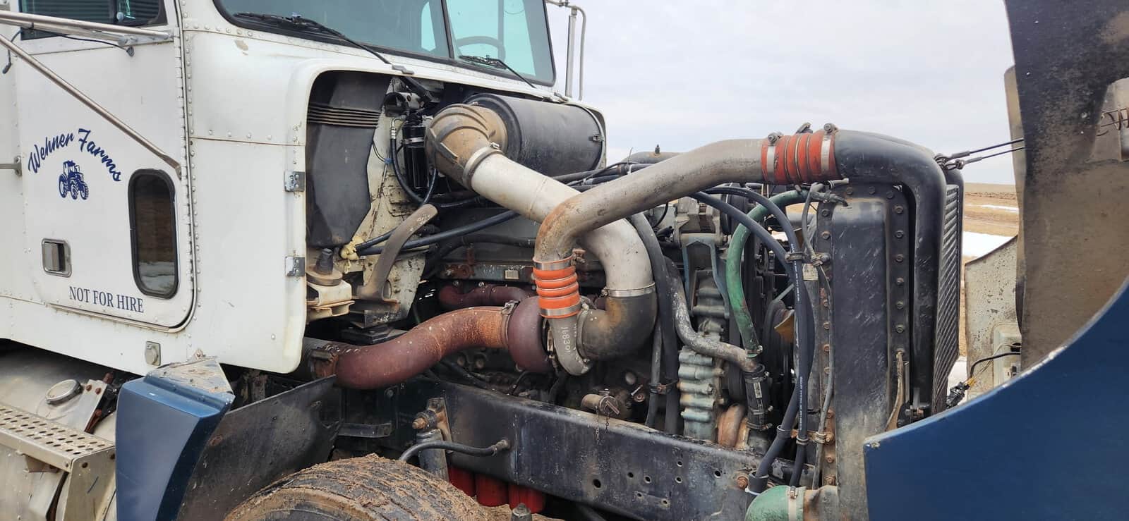 Recent updates include a new Bosch turbo, new exhaust manifold, rebuilt air compressor, and new air dryer. The driveline has been refreshed with all new U-joints and a carrier bearing installed about a year ago. The air ride cab has newer bags (approximately 4 years old), and the entire A/C system was overhauled in Fall 2025 along with new batteries installed at that time. The truck features spring ride suspension and has good rubber overall.